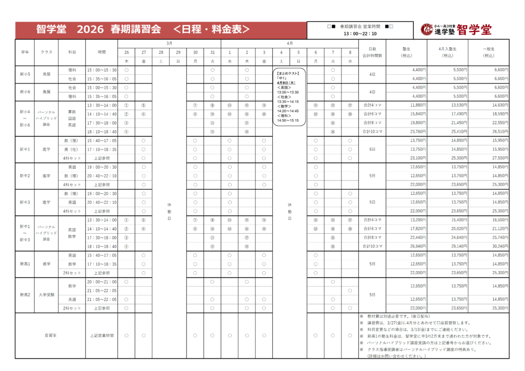 2026年2月25日 / 最終更新日 : 2026年2月25日 新村亮介 智学堂のお知らせ 受講生募集【2026年度・春期講習会】 春期講習会は、下記の通り実施いたします! ご興味のある方は、まず、お問い合わせください!体験から受け付けております!